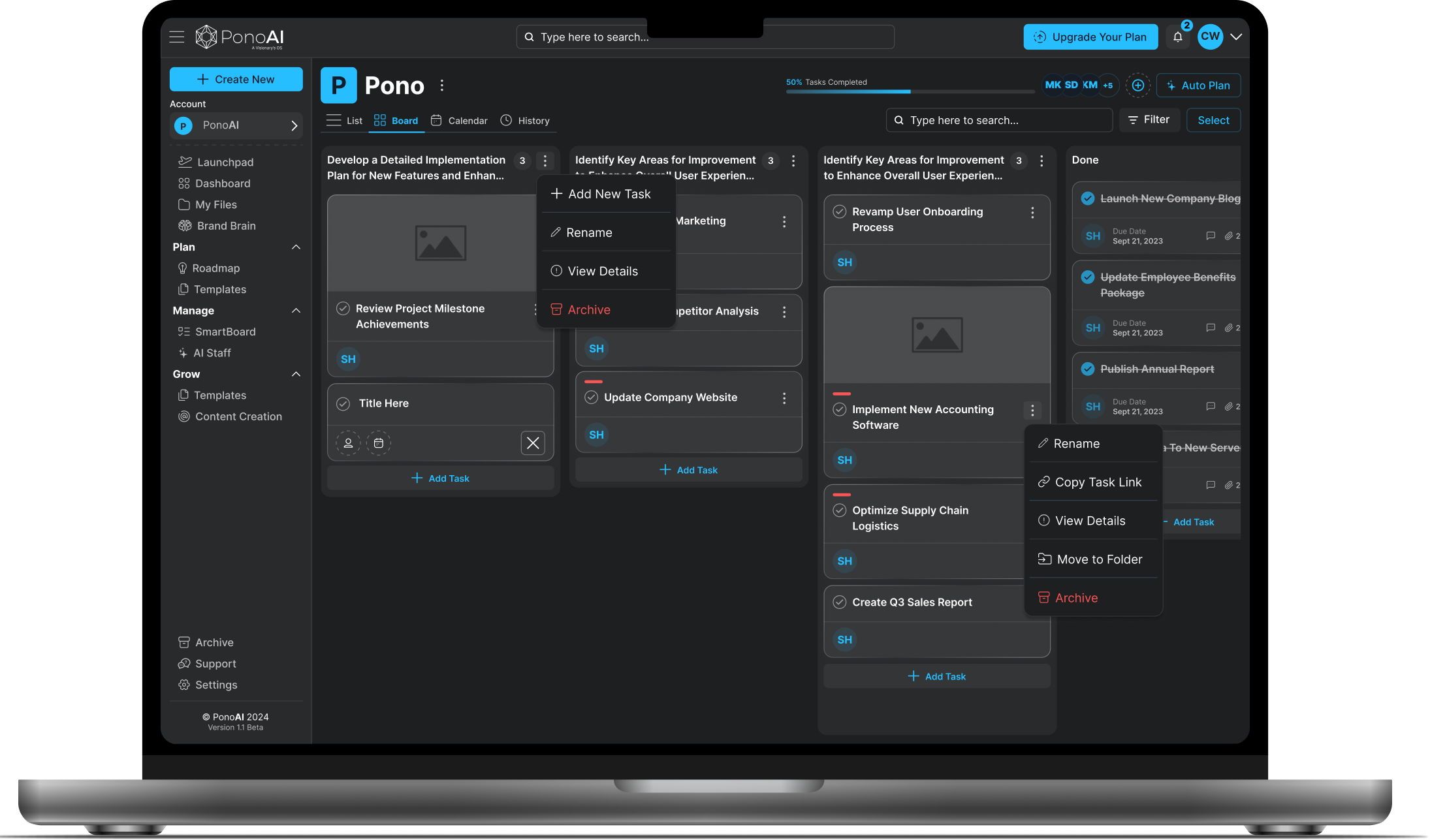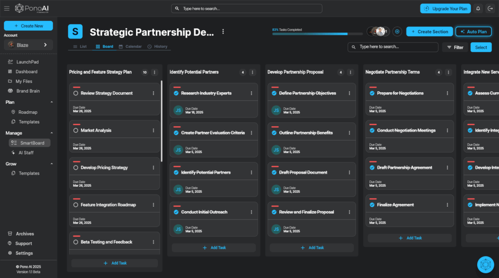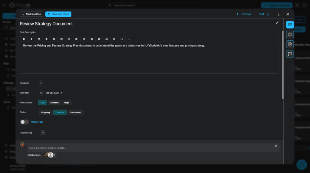 PonoAI’s Task Management system combines Roadmap-driven planning, SmartBoard execution, and AI Staff integration into one streamlined experience. Tasks are auto-generated based on your goals, assigned to users or AI, prioritized intelligently, and tracked from start to finish. With editable task details and the “Do It For Me” button, PonoAI helps you manage execution without the manual overhead.