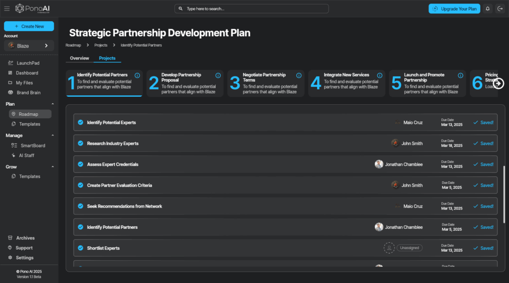 PonoAI’s Task Management system is built for entrepreneurs who need clarity and control. It combines automated task generation from your Roadmap, assignment tools, deadline tracking, and real-time progress monitoring. Integrated with AI Staff, it streamlines execution—so you can focus on strategy while PonoAI keeps everything moving.
